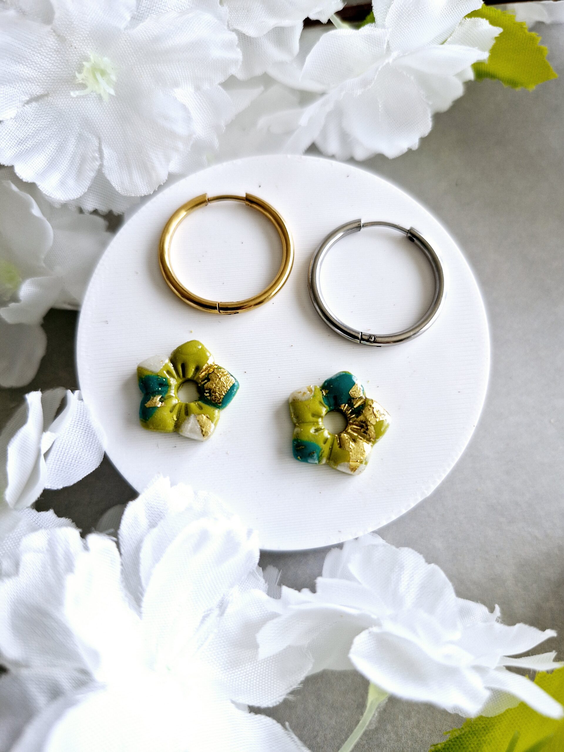 Ces pampilles en formes de fleurs sont réalisées à la main en pâte polymère, légères et agréables à porter.