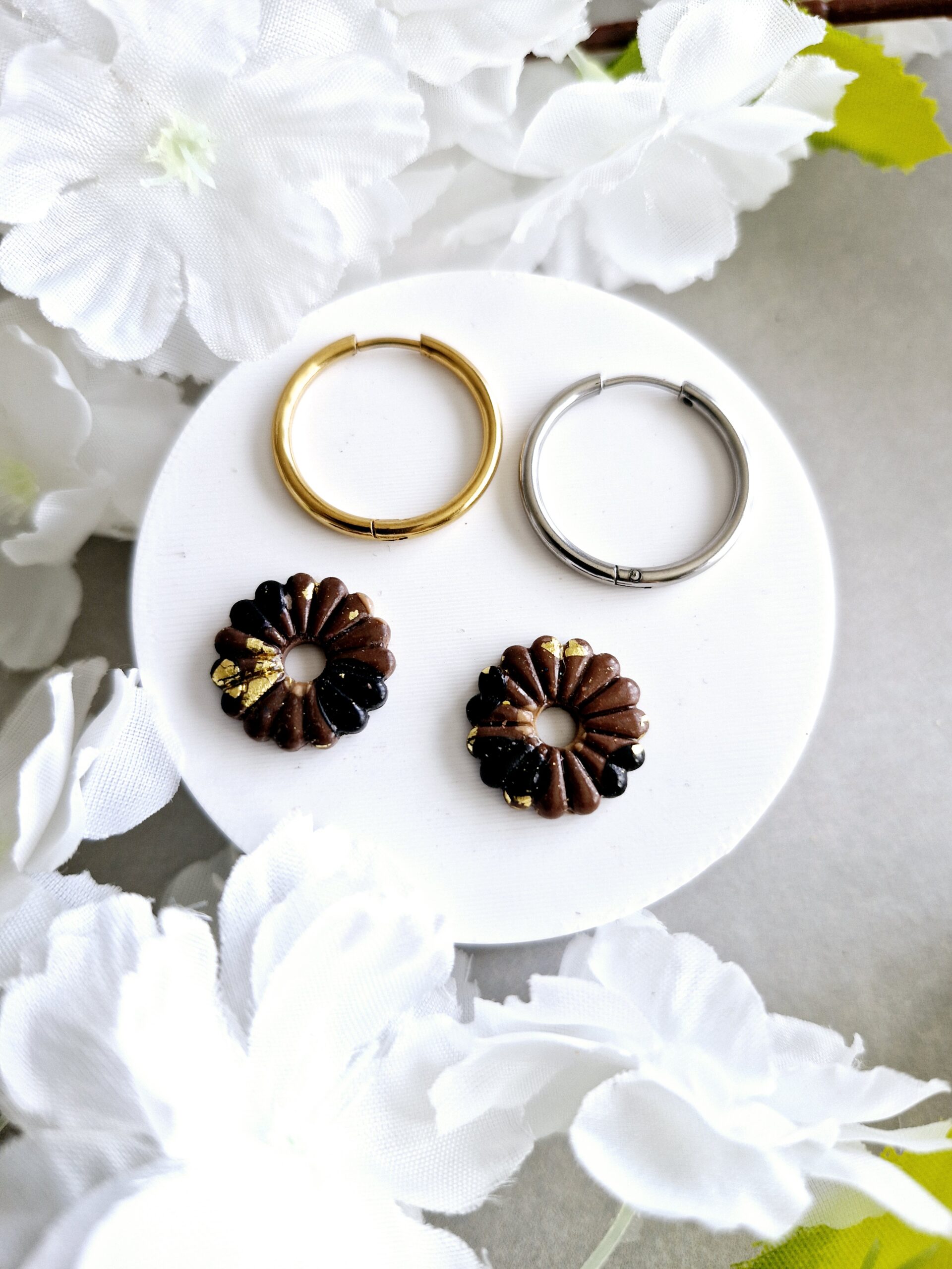 Ces pampilles en formes de fleurs sont réalisées à la main en pâte polymère, légères et agréables à porter.