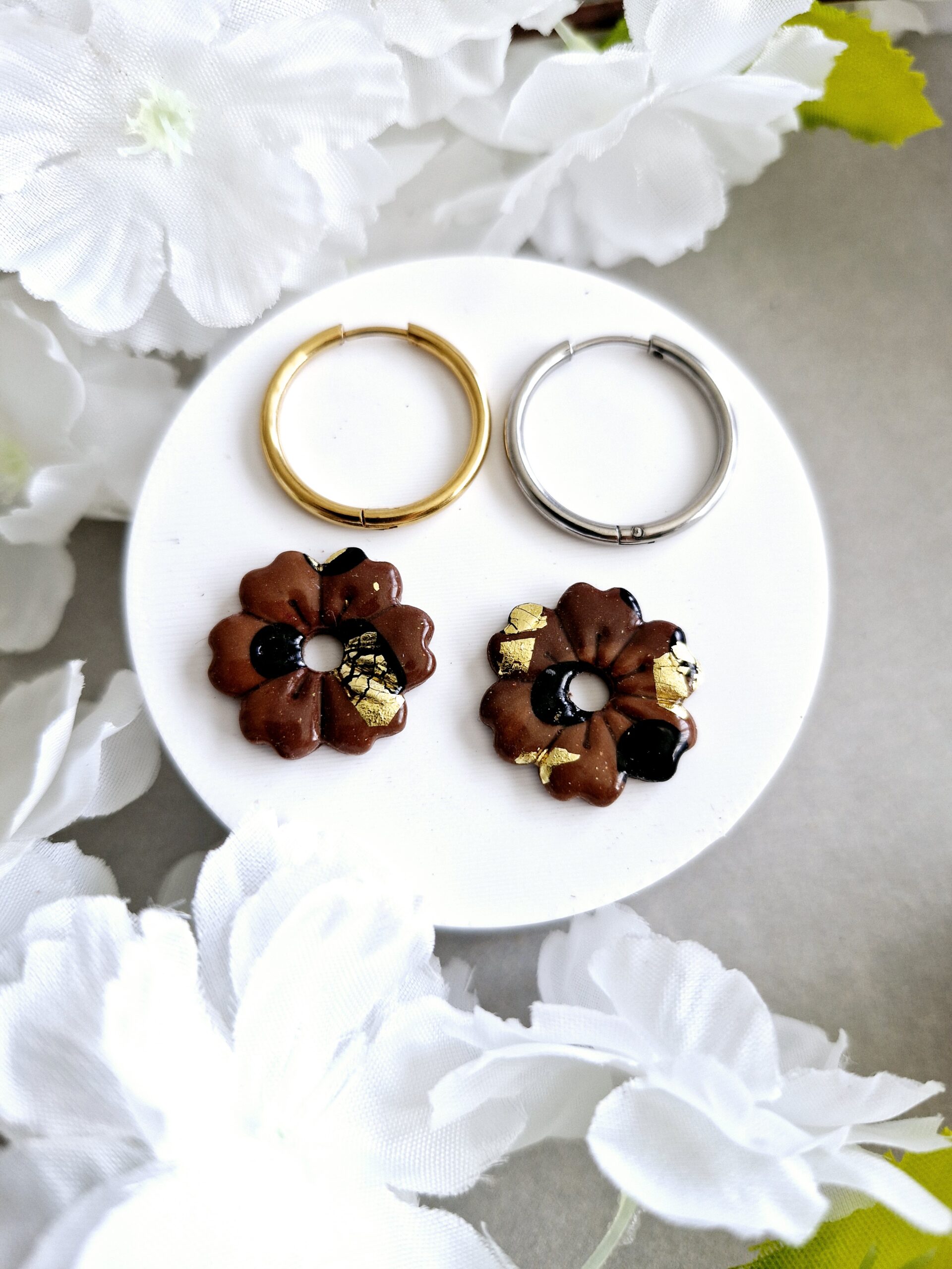 Ces pampilles en formes de fleurs sont réalisées à la main en pâte polymère, légères et agréables à porter.