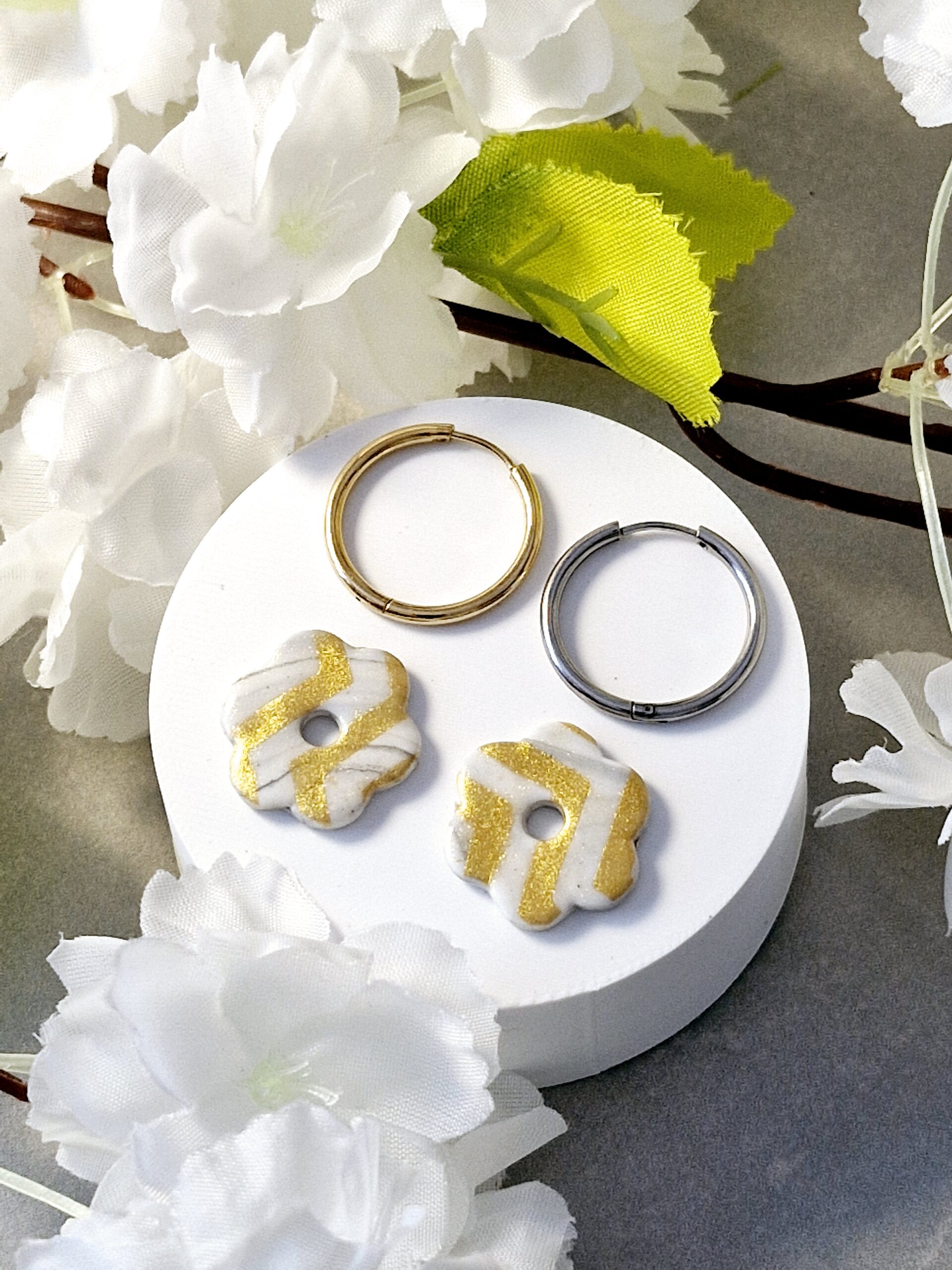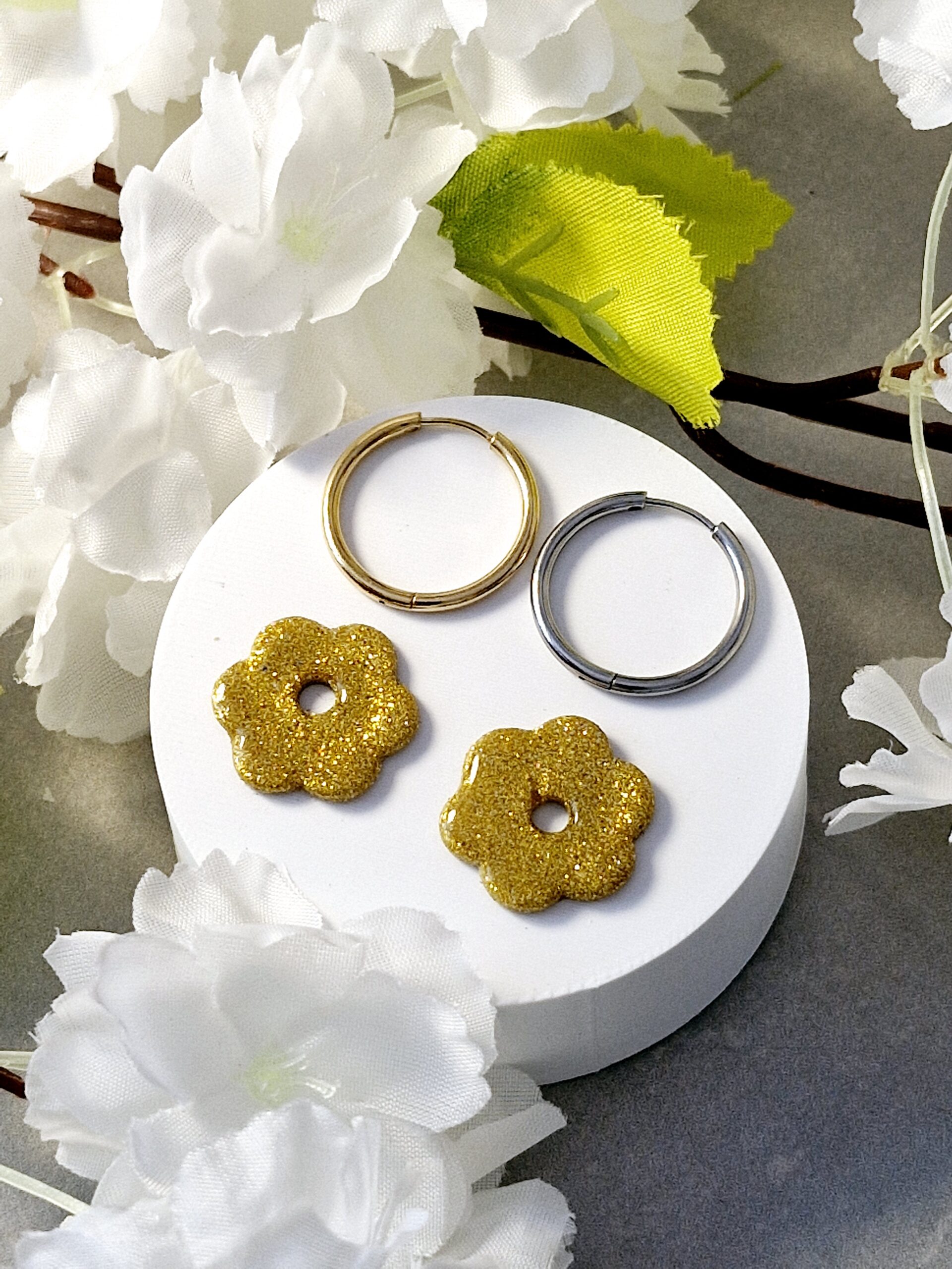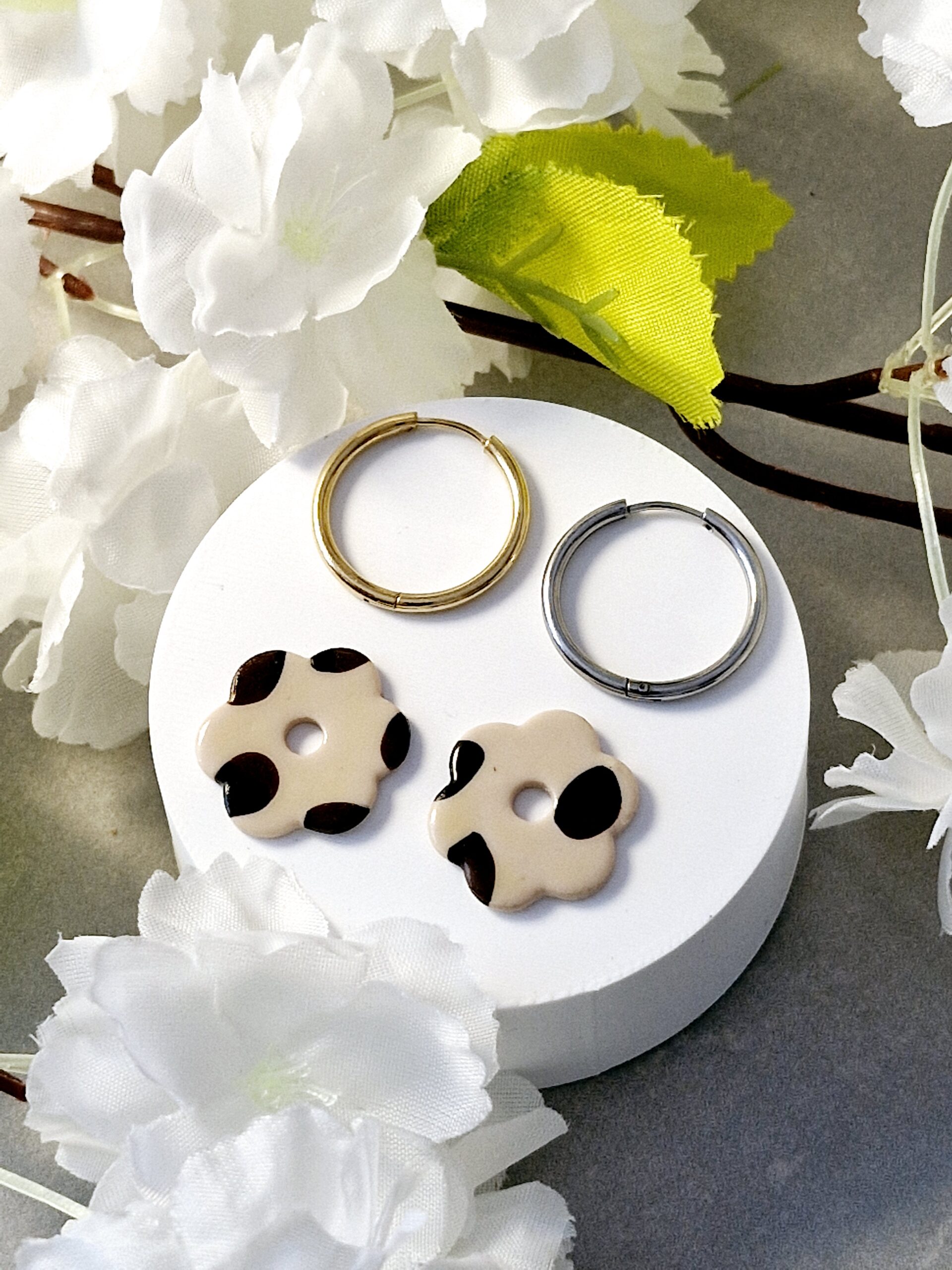 Ces pampilles en forme de fleur sont réalisées à la main en pâte polymère, légères et agréables à porter.